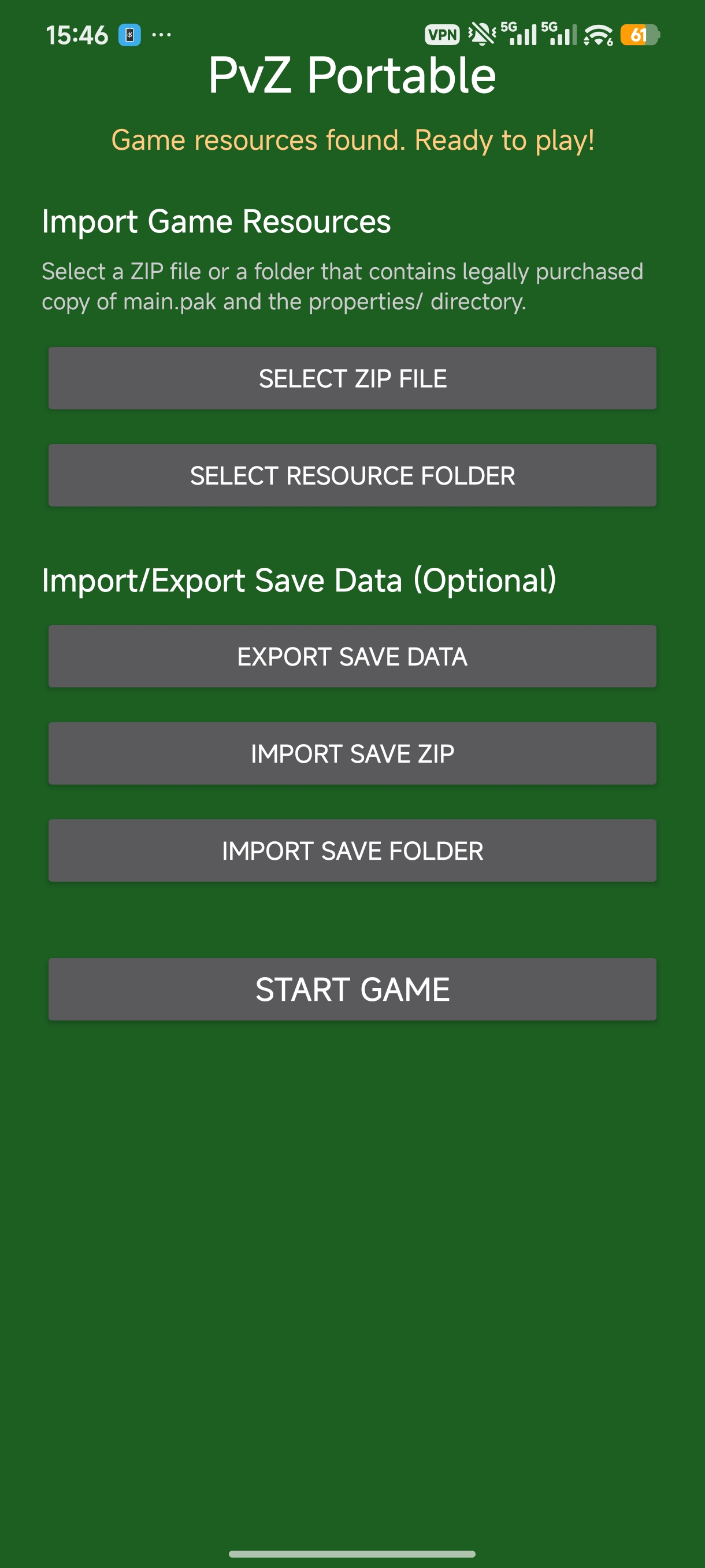 要研究或使用此项目,你必须拥有正版 PC 版《植物大战僵尸:年度版》(GOTY Edition)的资源文件(如果没有,请在 Steam 或 EA 官网上购买)。你需要从正版游戏中复制出 main.pak 和 properties/ 目录,通过应用内的导入功能导入到 PvZ-Portable 中。